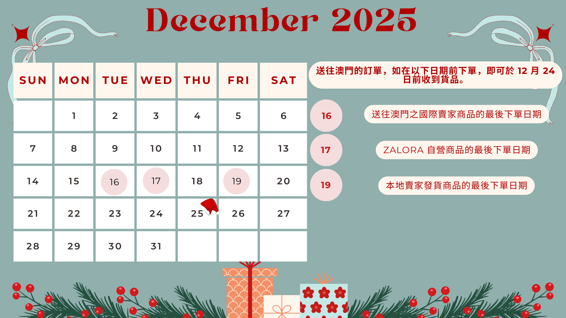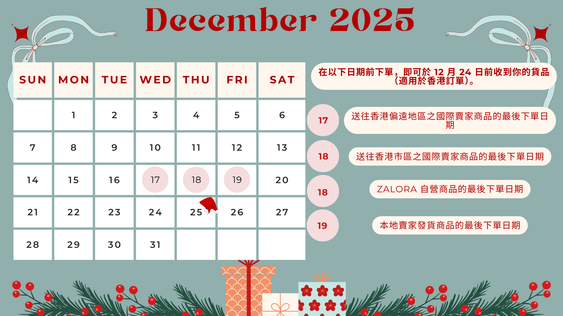為了方便你安排,我們特別準備了以下日曆,作為參考指南,讓你了解建議的最後下單日期,好讓訂單有更大機會在聖誕節前送達。